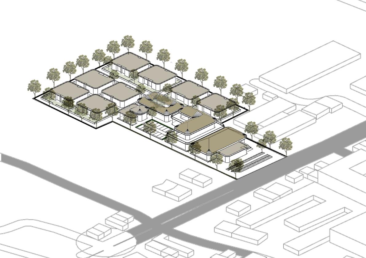 Konsep bentuk didapat dari penentuan sirkulasi dan zona antar bangunan, serta penyesuaian dengan bentuk tapak.