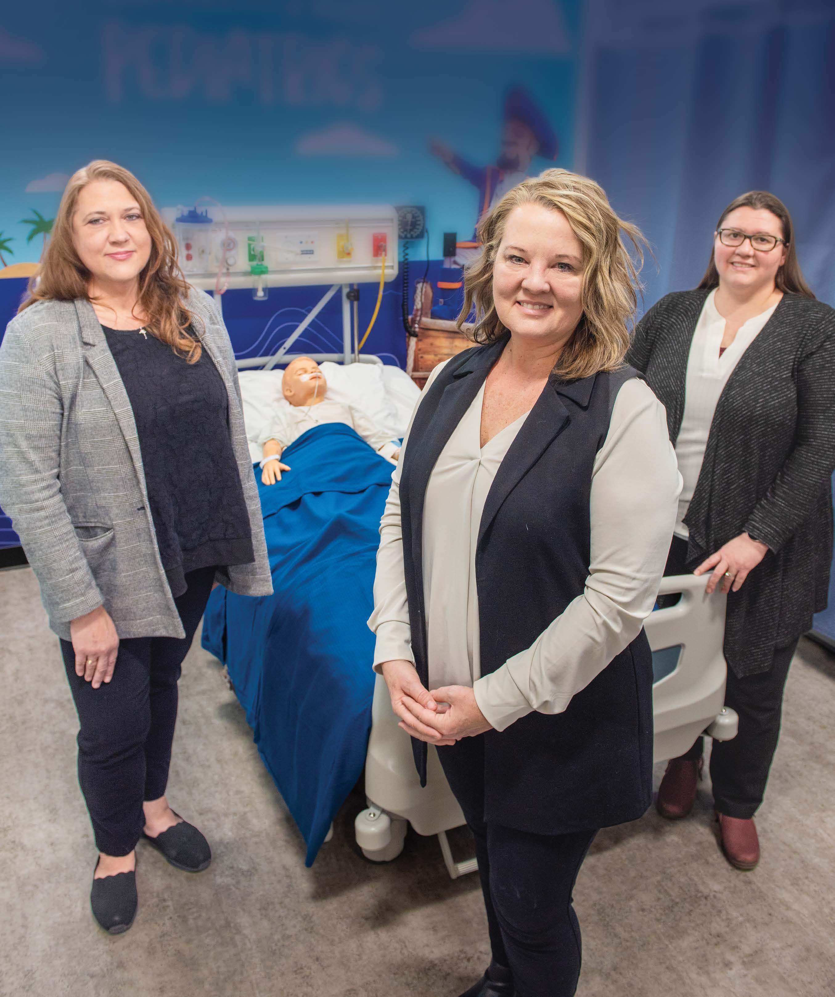 Dr. Molly Leer (left), Dr. Billie Madler (center), and Professor Sarah Berreth (right) pose in one of the Casey Center's new nursing simulation spaces.
