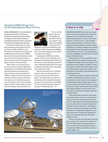 sense of smell but never gets tired or bored. Two researchers in the A. James Clark School of Engineering would like to create just such artificial noses. To build a nose on a chip, Elisabeth Smela, associate professor of mechanical engineering, and Pamela Abshire, assistant professor of electrical and computer engineering, are taking advantage of the work already done by nature in creating olfactory neurons—the exquisitely sensitive cells in biological noses that convert chemical signals into electrical ones. Smela points out, “It’s not possible for humanengineered systems to replicate what nature has developed over millions of years of evolution.” The researchers envision making “cell-based” sensors that could be sensitive and specific enough to spot counterfeit perfumes, detect poison gases in subway stations, warn soldiers of chemical weapons or even diagnose cancer. To achieve such goals, the researchers will need to position individual types of olfactory neurons over electronic sensors, keep the cells separated in individual vials, provide a steady supply of nutrients and remove waste. When the cells of a particular type fire, sensors under them will need to detect those electrical signals, and the circuitry on the chip will have to interpret the signals coming from the different cells. At this point, Smela and Abshire have a prototype chip less than 1/16 of an inch across and containing 10 to 20 vials. Smela can open and close each micro-vial independently. Meanwhile, Abshire has been able to detect and transmit signals from individual cow heart cells, which—like olfactory neurons—produce electrical signals. Once Smela and Abshire can reliably detect signals from cow heart cells, which are robust and easily grown in culture, the researchers will start working with olfactory neurons. They are a long way from being able to reproduce even a portion of the capacity of an animal’s nose, but if this field flourishes, cell-based electronic noses could become essential tools everywhere from agricultural fields to battlefields, wineries to doctors’ offices. —KJ