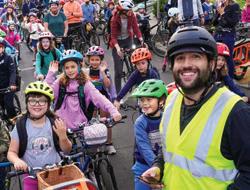 Phys ed teacher Sam Balto ’07 leads students on group bike rides to school. His “bike bus” is gaining traction worldwide.