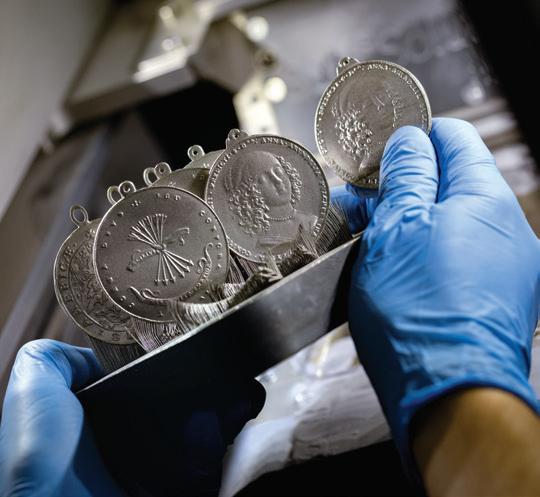 BOBBY ALBAN ’25, an aerospace engineering major and technical coordinator for the Terrapin Works, removes 3D-printed peace medals from an advanced metal printer in the Chemical and Nuclear Engineering Building in November. The Piscataway Tribe, upon whose ancestral lands the University of Maryland sits, collaborated with the 3D printing and rapid prototyping service in the A. James Clark School of Engineering to create replicas of three medals, which were originally given to American Indian tribes by English colonists and later found stowed in museum storage. The models “become a physical reminder that people can come see and touch to be able to understand this aspect of not only colonial Maryland history or colonial Pennsylvania history, but also early American history,” says Mario Harley, a Piscataway tribal member and historian.—AK
