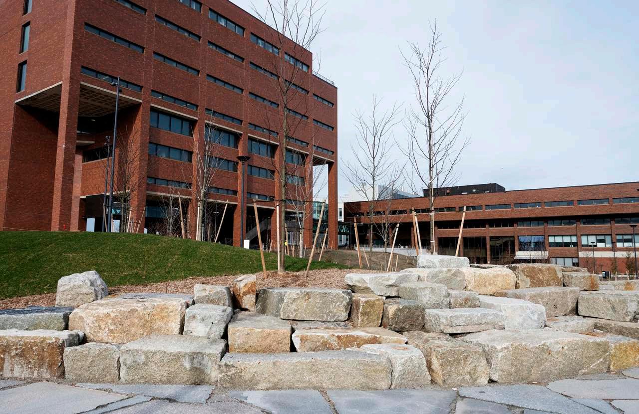 Chancellor Marcelo Suárez-Orozco on UMass Boston’s recently renovated central plaza. Photo by Kathleen Dooher.