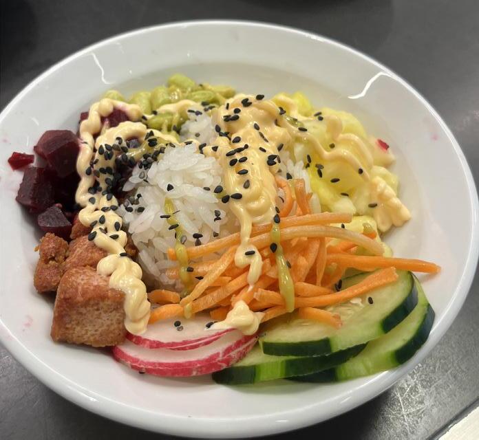 Happy Earth Day! We worked with a first year sustainability class to help promote our sustainability initiatives and celebrate Earth Day. The sustainability students created posters to highlight sustainability initiatives in the dining hall and best practices for students on campus. Our team also brought in High Time Foods who specialize in global plant-based foods. The High Time Foods team joined us on Earth Day for a station take over with Nepali Momo Dumplings on the Innovate station.