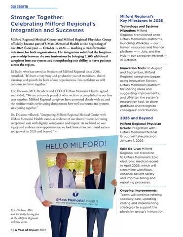 Stronger Together: Celebrating Milford Regional’s Integration and Successes Milford Regional Medical Center and Milford Regional Physician Group officially became part of UMass Memorial Health at the beginning of our 2025 fiscal year — October 1, 2024 — marking a transformative milestone for both organizations. The integration solidified the longtime partnership between the two institutions by bringing 2,500 additional caregivers into our system and strengthening our ability to serve patients across the region. Ed Kelly, who has served as President of Milford Regional since 2008, remarked, “It’s been a very busy and productive year of transitions, shared learnings and growth for both of our organizations. I’m confident we will continue to thrive together.” Eric Dickson, MD, President and CEO of UMass Memorial Health, agreed and added, “We are extremely proud of what we have accomplished in our first year together. Milford Regional caregivers have partnered closely with us, and the positive results we’re seeing demonstrate how well our teams and systems are coming together.” Dr. Dickson reflected, “Integrating Milford Regional Medical Center with UMass Memorial Health stands as evidence of our shared vision: delivering exceptional care with dignity, compassion and respect. As we build on our legacy and embrace new opportunities, we look forward to continued success and growth in 2026 and beyond.” •
