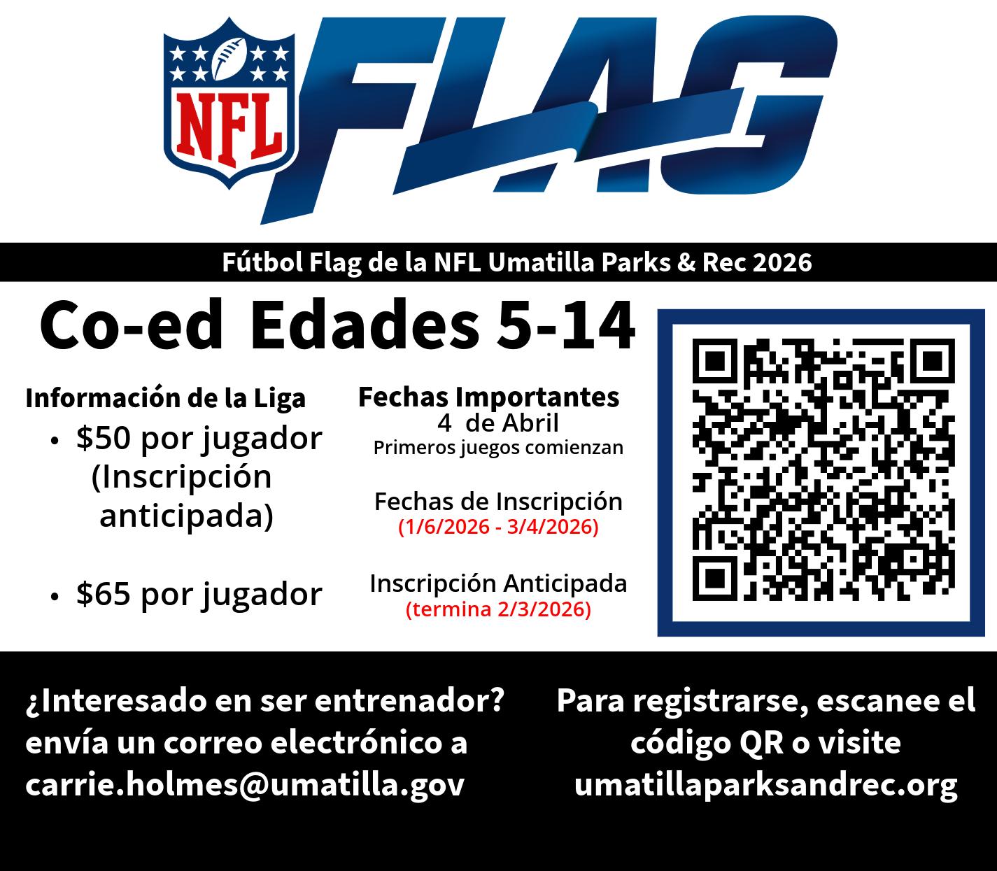 Ya est谩n abiertas las inscripciones para la liga de F煤tbol Bandera de Umatilla. La temporada comienza el 4 de Abril con una fecha l铆mite de inscripci贸n del 4 de Marzo. Por favor, visite el sitio web para obtener m谩s informaci贸n y reglas.