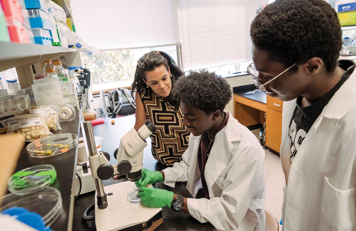 (TOP) Ph.D. candidates Luke Mason and Winny Sun, and Maki Negesse, Ph.D. ‘24, biological sciences, work together in associate professor of biological sciences Erin Green’s lab.