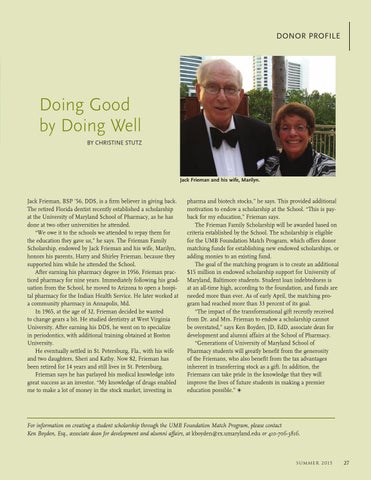 pharma and biotech stocks,” he says. This provided additional motivation to endow a scholarship at the School. “This is payback for my education,” Frieman says. The Frieman Family Scholarship will be awarded based on criteria established by the School. The scholarship is eligible for the UMB Foundation Match Program, which offers donor matching funds for establishing new endowed scholarships, or adding monies to an existing fund. The goal of the matching program is to create an additional $15 million in endowed scholarship support for University of Maryland, Baltimore students. Student loan indebtedness is at an all-time high, according to the foundation, and funds are needed more than ever. As of early April, the matching program had reached more than 33 percent of its goal. “The impact of the transformational gift recently received from Dr. and Mrs. Frieman to endow a scholarship cannot be overstated,” says Ken Boyden, JD, EdD, associate dean for development and alumni affairs at the School of Pharmacy. “Generations of University of Maryland School of Pharmacy students will greatly benefit from the generosity of the Friemans, who also benefit from the tax advantages inherent in transferring stock as a gift. In addition, the Friemans can take pride in the knowledge that they will improve the lives of future students in making a premier education possible.” b