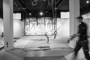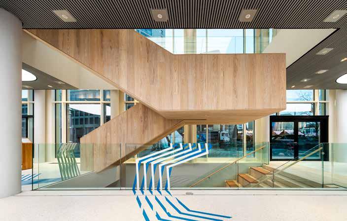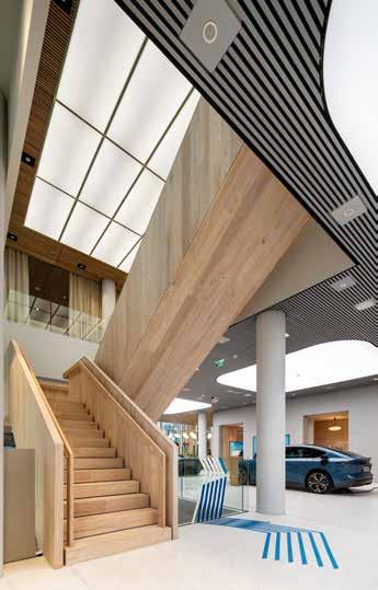 printed concrete walls: “In the space for the central staircase, warm oak and untreated black steel form an arc of tension which is full of contrasts.” A conscious decision was taken to use local suppliers for the materials: illuminated glass walls from a Bavarian manufacturer, for example, which draws attention to the poured floor covering of Munich pebbles.
