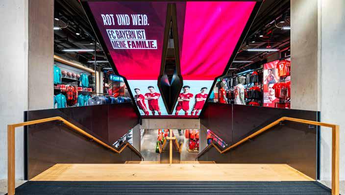 The flagship of the Munich football club is spread out across three floors, accessed via a central staircase which links together tradition and future and thus symbolises the two elements behind the store concept. The prominent diamond in the stairwell, a reference to the Bavarian coat of arms in the logo, provides a visual link to all floors. The emotional heart is the oversized LED wall on the underside of the staircase.