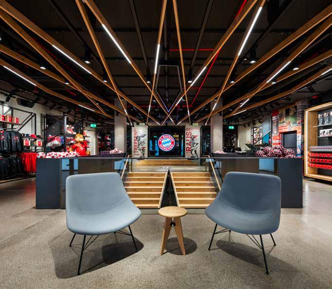 For a unique customer experience, numerous digital innovations were integrated with cooperation with various firms, including mirror screens in the changing cabins, several selfie points and transparent screens for the trophy presentation and projection mapping in the checkout area. In the basement lies the Performance Level, realised in cooperation with adidas, where fans have access to the full kit – from jerseys to training equipment to shoes, which are arranged along the wall. It is designed like a laboratory in which the new developments can grow and mature. A further highlight is the “Test Cage”. Here visitors can pit themselves against the professionals in various gaming scenarios. Jerseys, shoes and balls can be personalised in the “workshop” according to the fans’ individual wishes. The presentation of the “TRIPLE Cups 2020” takes place in digital showcases behind transparent screens and underlines the playful experience of winning. There is even a special area dedicated to the e-sports team of FC Bayern: