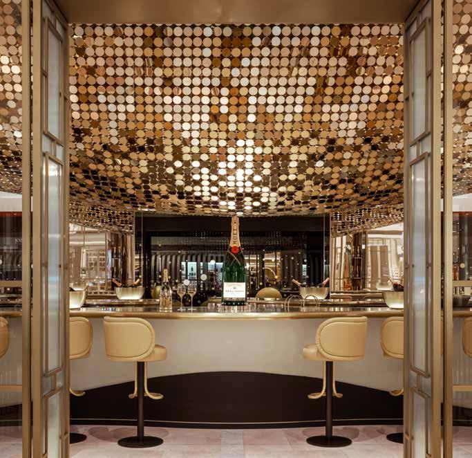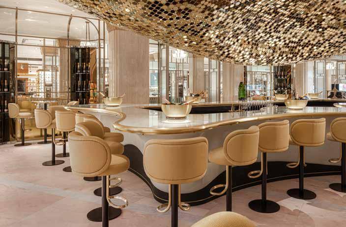 Champagne has settled in England; Epérnay goes London-Knightsbridge. Here, on the ground floor of Harrods, in the middle of the Beauty Halls, the French champagne cellars have opened a bar under their own brand name. As long-standing partners of the world-famous department store, the Store Makers at umdasch were chosen to accompany the project – with the successful implementation of the design concept, which was drawn up by the London design studio Sybarite. The bar extends across an area of 200 square metres and is the first independent location of Moët & Chandon in Europe. It is not only because this is a premiere that it has no rival. It is thanks first and foremost to the imposing chandelier, made by hand from some 60,000 shimmering gold metal discs and a further 240,000 brass rings spanning the boldly curving bar counter with its 34 seats like a canopy. Looking back,