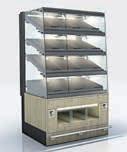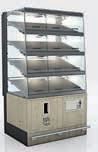 The finished Bakeshop consists of a combination of any number of bakery Boxes. A steel frame with four different angles of inclination and adjustable heights on each level provides optimal presentation possibilities and easy reloading. A Bakery Box unit consists of four presentation levels plus a service unit. Single-pane safety glass unit fronts ensure maximum visibility of the product and the automatic damping mechanism ensures the flaps close slowly. The individual wood decor enable your Bake Off System to be individually adapted to the store design.