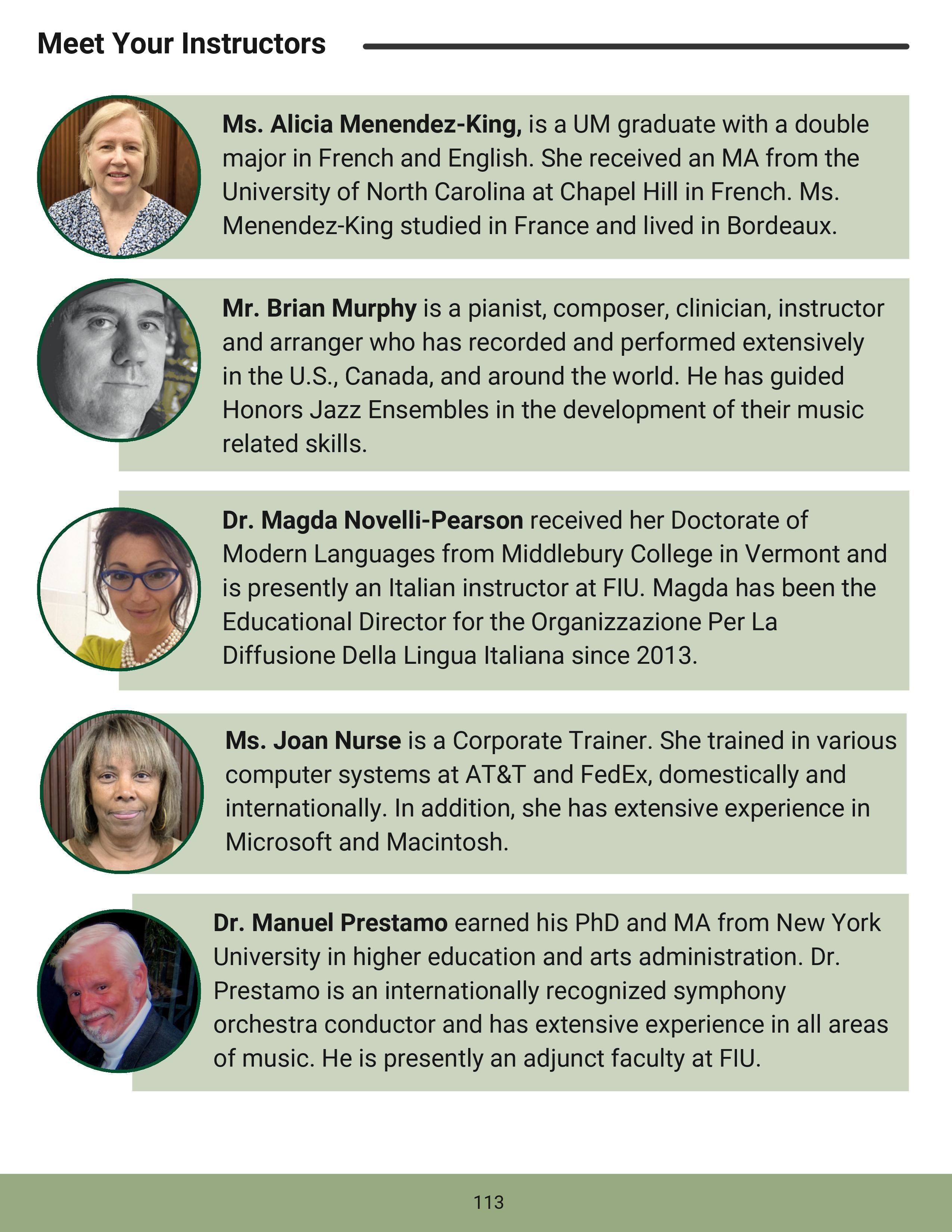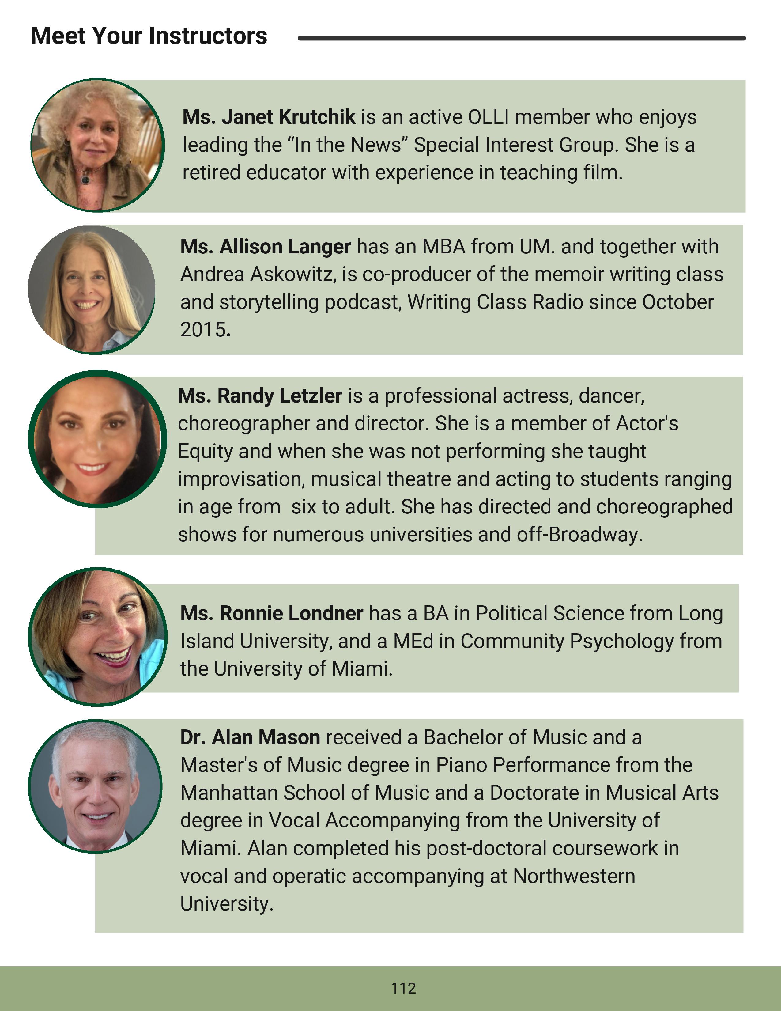 Welcome to the Fall 2025 semester at the Osher Lifelong Learning Institute (OLLI) at the University of Miami! I am happy to welcome back all our returning members and extend a warm welcome to our new and prospective members. Our catalog contains important information about courses, registration, and membership benefits and I encourage you to take some time to review it.