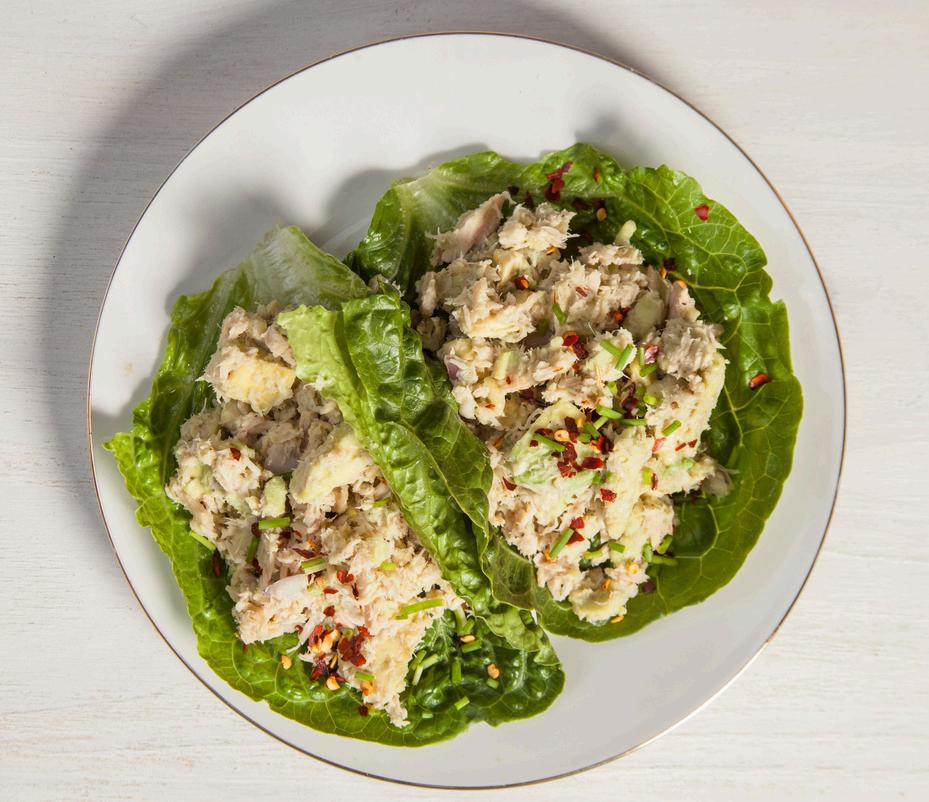 You can find tuna salad at the Deli station in either dining hall. Simply ask an associate for a scoop, as well as a few pieces of lettuce. Season with salt and pepper and top with your favorites such as tomatoes, avocado, hard boiled eggs, etc Finally, close the lettuce leaf and enjoy! Note: this can also be a very yummy bowl or salad combo!