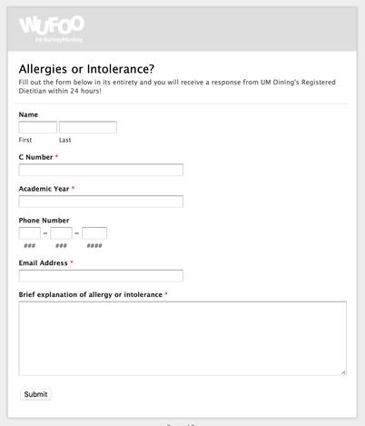 Reportanydiningissuesorallergicreactions immediatelytoaUMDiningManageror Dietitian.