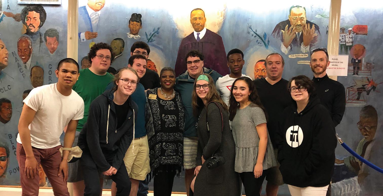 Honors students visited the Dexter Avenue Church in Montgomery, Alabama, where Martin Luther King lived and worked during the 1955 bus boycott. They are pictured with Wanda Battle (center), director of tour ministry.