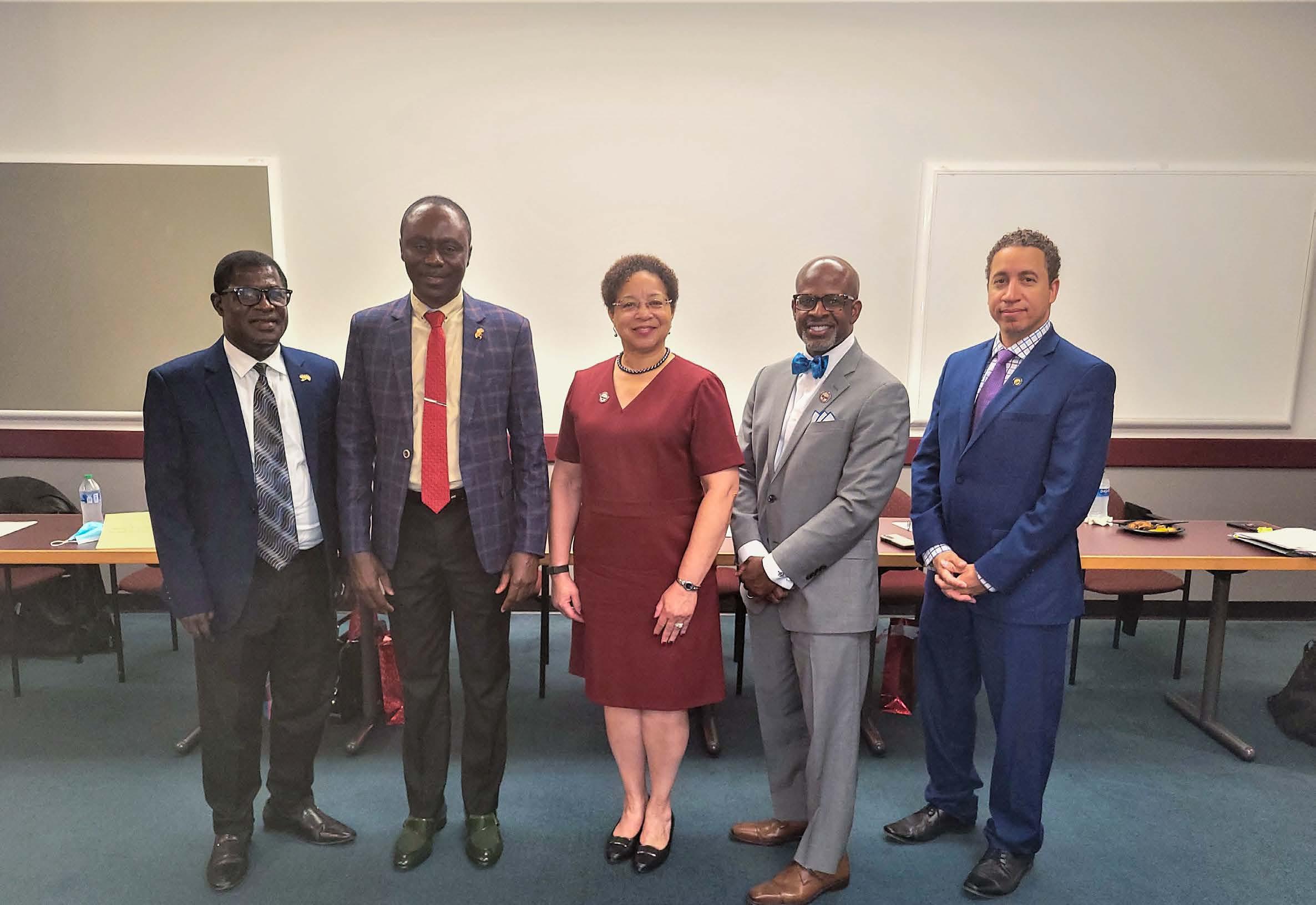 UMES President Dr. Heidi M. Anderson (center) poses with Provost and Vice President for Academic Affairs, Dr. Rondall Allen (right), School of Pharmacy and Health Professions Interim Dean, Dr. T. Sean Vasaitis (far right), Sunyani Technical University (Ghana) Vice-Chancellor Professor Ing. Kwadwo Adinkrah-Appiah (left), and STU registrar and COO Samuel Obour (far left) during an articulation agreement ceremony involving the two schools.