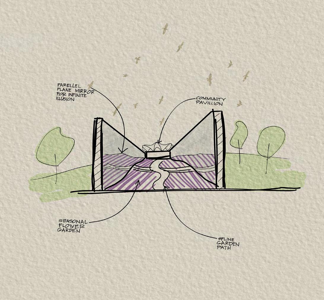 Gigantic plain mirrors of 12m height placed parallely facing each other that reflects the garden in between infinitely which creates illusion of a garden extended till the horizon.