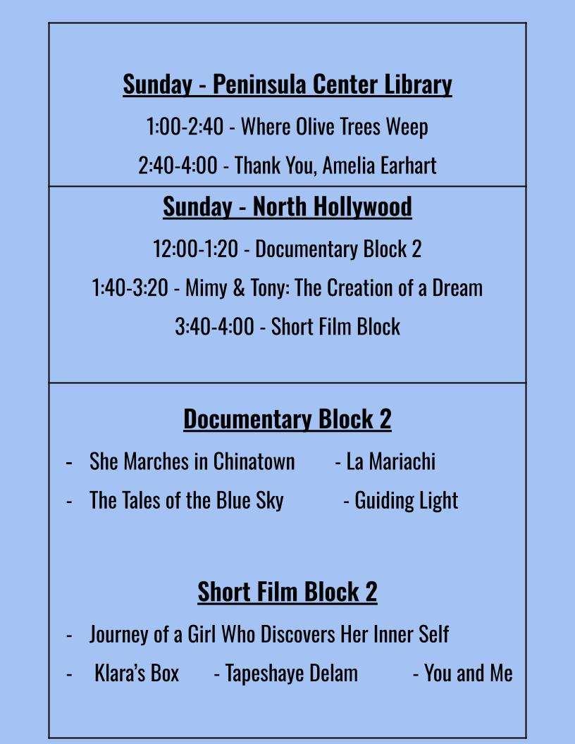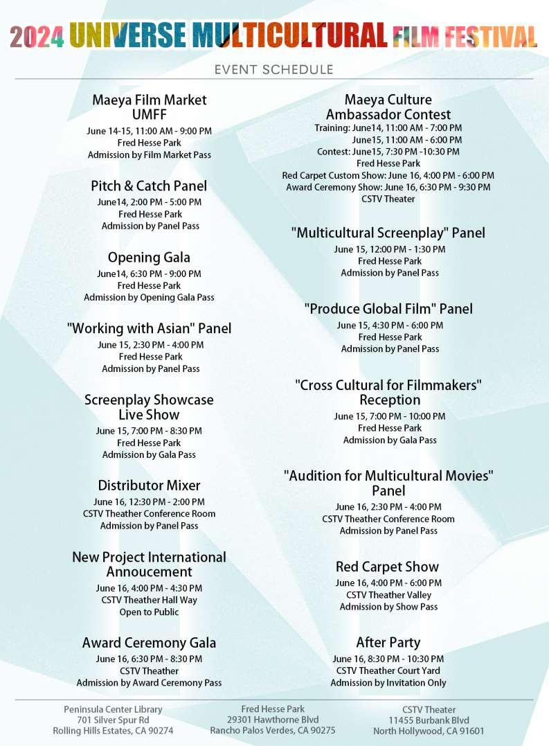 2023 UNIVERSE MULTICULTURAL FILM FESTIVAL Advisor Board WhipHubley RajuChhabria ChristopherCoppola UMFF Committee CHAIRWOMAN TracyReiner EXECUTIVE DIRECTOR LynnTang MARKETING DIRECTOR MayGoldi PUBLIC RELATION JessicaHaro GRAPHIC DESIGNER LerChang ConnorPierson AmySparrow, VIDEO EDITOR Daniel Reyes Facebook.com/UMFFestival @ UMFFFestival