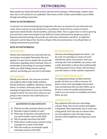 WHAT IS NETWORKING? A network is an interconnected group of supporters who serve as resources for your job search and career. Some contacts you may already have are professors, Career Services, current or former supervisors, family friends, church members, and many others. Now is a great time to work on growing your network to meet more people in your field! Get contact information for people you meet at business and social meetings who provide you with career information and advice. It might feel awkward to ask for help at first, but this is all part of the job search process. You will get better at making connections by practicing!