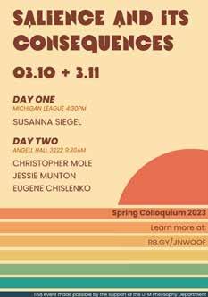 Martin Luther King Jr. Symposium that featured a talk by UM’s SaraEllen Strongman (Assistant Professor, Department of Afro-American and African Studies). During March 2023, our graduate students organized a Spring Colloquium on the topic Salience and Its Consequences. Speakers included Susanna Siegel (Harvard), Jessie Munton (Cambridge), Christopher Mole (Oxford), and Eugene Chislenko (Temple). Our graduate students also hosted the annual Michigan-MIT Social Philosophy workshop, which featured Sahar Heydari Fard (Ohio State University), and organized the Ancient Philosophy Workshop, which featured Christian Wildberg (University of Pittsburgh).