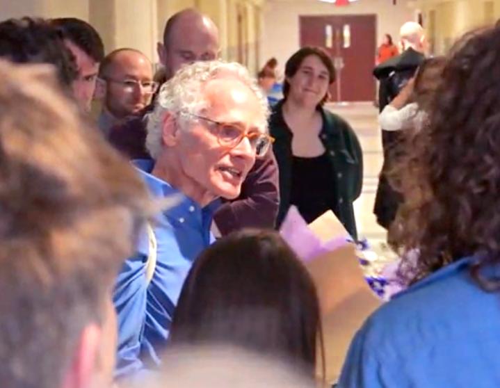 Peter Railton is warmly greeted by colleagues and students as he exits his final class before retirement