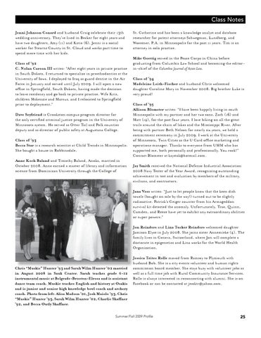 St. Catherine and has been a knowledge analyst and database researcher for patent attorneys Schwegman, Lundberg, and Woessner, P.A. in Minneapolis for the past 11 years. Tim is an attorney in solo practice. Mike Goettig served in the Peace Corps in China before graduating from Columbia Law School and becoming the editorin-chief of the Columbia Journal of Asian Law. Class of ’94 Madeleine Leith-Fischer and husband Chris welcomed daughter Caroline Mary in November 2008. Big brother Luke is very proud! Class of ’95 Allison Blomster writes: “I have been happily living in south Minneapolis with my partner and her two sons, Zach (16) and Matt (14), for the past four years. I love biking on all the great trails around the chain of lakes and the Mississippi River. After being with partner Beth Nelson for nearly six years, we held a commitment ceremony in July 2009. I work at the University of Minnesota, Twin Cities as the U Card office marketing and operations manager. Thanks to everyone from UMM who has supported me, both personally and professionally. You rock!” Contact Blomster at kaystak@hotmail.com. Jay Smith received the National Defense Industrial Association 2008 Navy Tester of the Year Award, recognizing outstanding achievement in test and evaluation by members of the military, civilians, and contractors. Jana Voss writes: “Just to let people know that the keen dish towels (bought on sale by the way!) turned out to be slightly radioactive. Patrick’s Geiger counter from his Armageddon survival kit detected the anomaly. Unfortunately, Trae, Quinn, Camden, and Reece have yet to exhibit any extraordinary abilities or super powers.” Jon Reinders and Lina Tucker Reinders welcomed daughter Jamison Elyse in July 2008. She joins sister Annemieke (4). The family lives in Geneva, Switzerland, where Jon will complete a doctorate in epigenetics and Lina works for the World Health Organization.