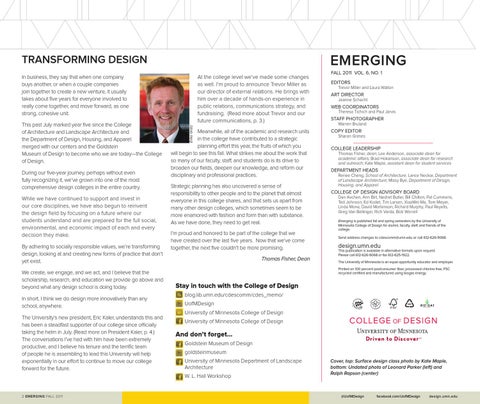 Dan Avchen, Ann Birt, Nedret Butler, Bill Chilton, Pat Cummens, Ted Johnson, Ed Kodet, Tim Larsen, XiaoWei Ma, Tom Meyer, Linda Mona, David Mortenson, Richard Murphy, Paul Reyelts, Greg Van Bellinger, Rich Varda, Bob Worrell Emerging is published fall and spring semesters by the University of Minnesota College of Design for alumni, faculty, staff, and friends of the college. Send address changes to cdescomm@umn.edu or call 612-626-9068.