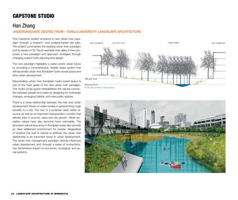 CAPSTONE STUDIO Han Zhang UNDERGRADUATE DEGREE FROM—TONGJI UNIVERSITY, LANDSCAPE ARCHITECTURE This Capstone project envisions a new urban river paradigm through a research- and analysis-based site plan. The project summarizes the existing urban river paradigm and its issues on St. Paul’s westside river valley. It then proposes a new paradigm and approach strategies through changing scale in both planning and design. The new paradigm highlights a water-centric urban future by providing a comprehensive, flexible water system that will rejuvenate urban river floodplain hydro-social space and drive urban development. Rejuvenating urban river floodplain hydro-social space is one of the main goals of the new urban river paradigm. This hydro-social space reestablishes the natural connection between people and water by designing for hydrologic changes, ecological habitat, and new public spaces. There is a close relationship between the river and urban development. Rivers or water bodies in general bring huge benefits to a city. The river is a potential clean water resource as well as an important transportation corridor that directly links to econoic value and city growth. Other recreation values have also become more noticeable. The abundant natural resources in floodplain areas also provide an ideal settlement environment for people. Regardless of whether the river is natural or artificial, the urban river relationship is an important factor in urban development. The urban river management paradigm directly influences urban development and, through a series of connections, has tremendous impact on economic, ecological, and social systems.