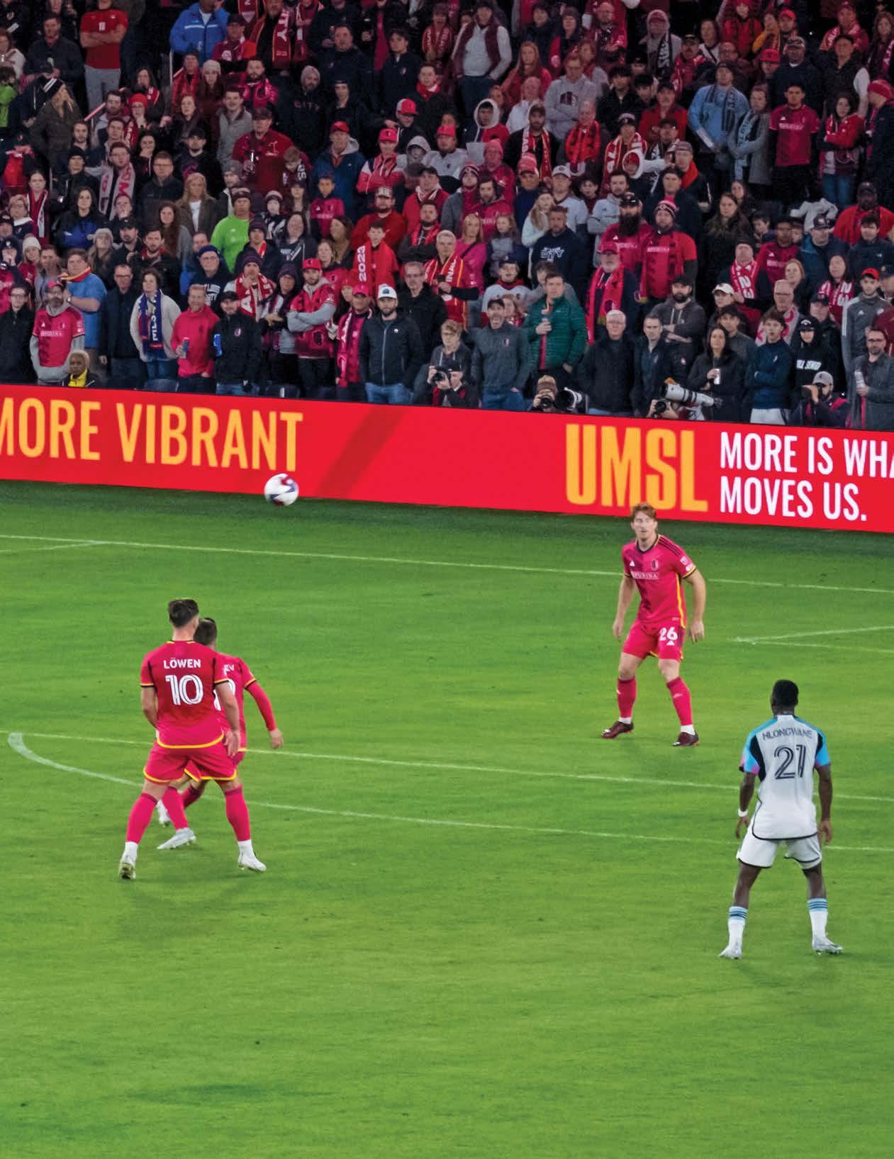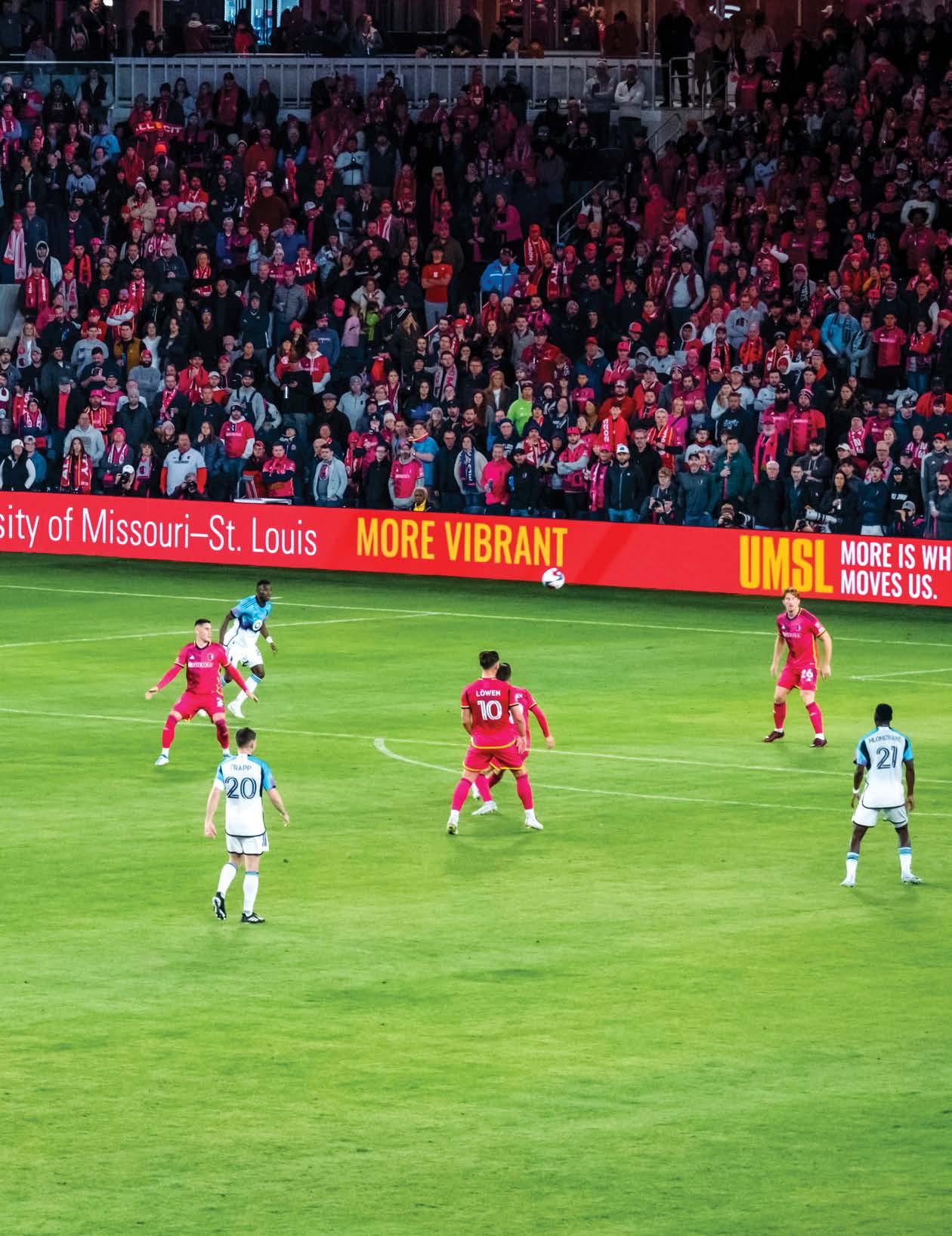 Louis CITY SC faces off against Minnesota United FC at CITYPARK in St. Louis on April 1. UMSL is the official higher education partner of the new expansion team and is working closely with the soccer club to expand the university’s sport management offerings and launch its first-ever competitive esports team. Turn to page 9 for more.