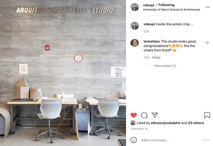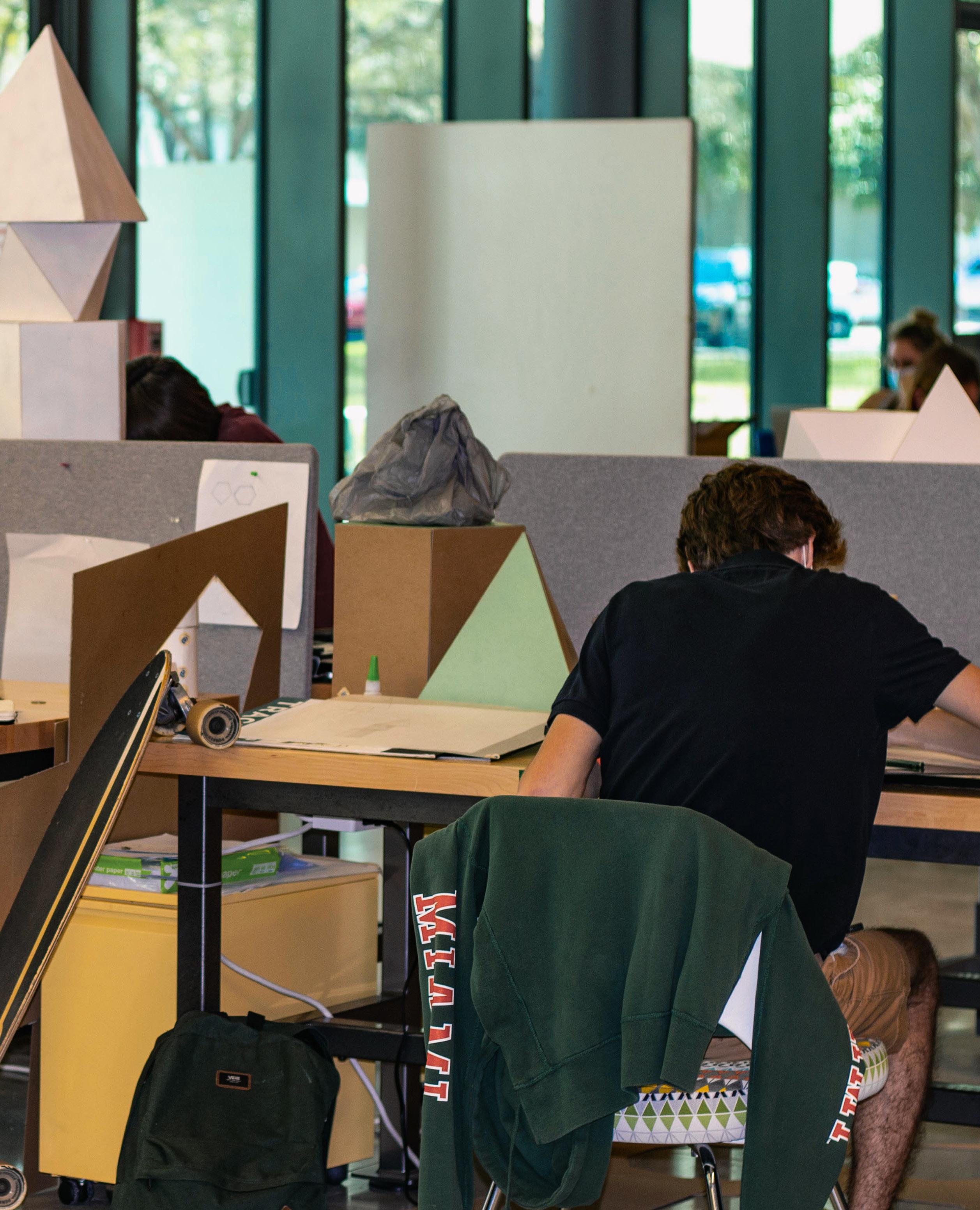 all done to improve social distancing without negatively impacting curriculum. Guerrero said the Thomas P. Murphy Design Studio Building’s large, open, flexible space lent itself well to installing Plexiglas partitions, creating ample circulation space and configuring distancing around large tables. She said the Korach Gallery in the Jorge M. Perez Architecture Center was turned into a classroom, to provide an additional safe space.