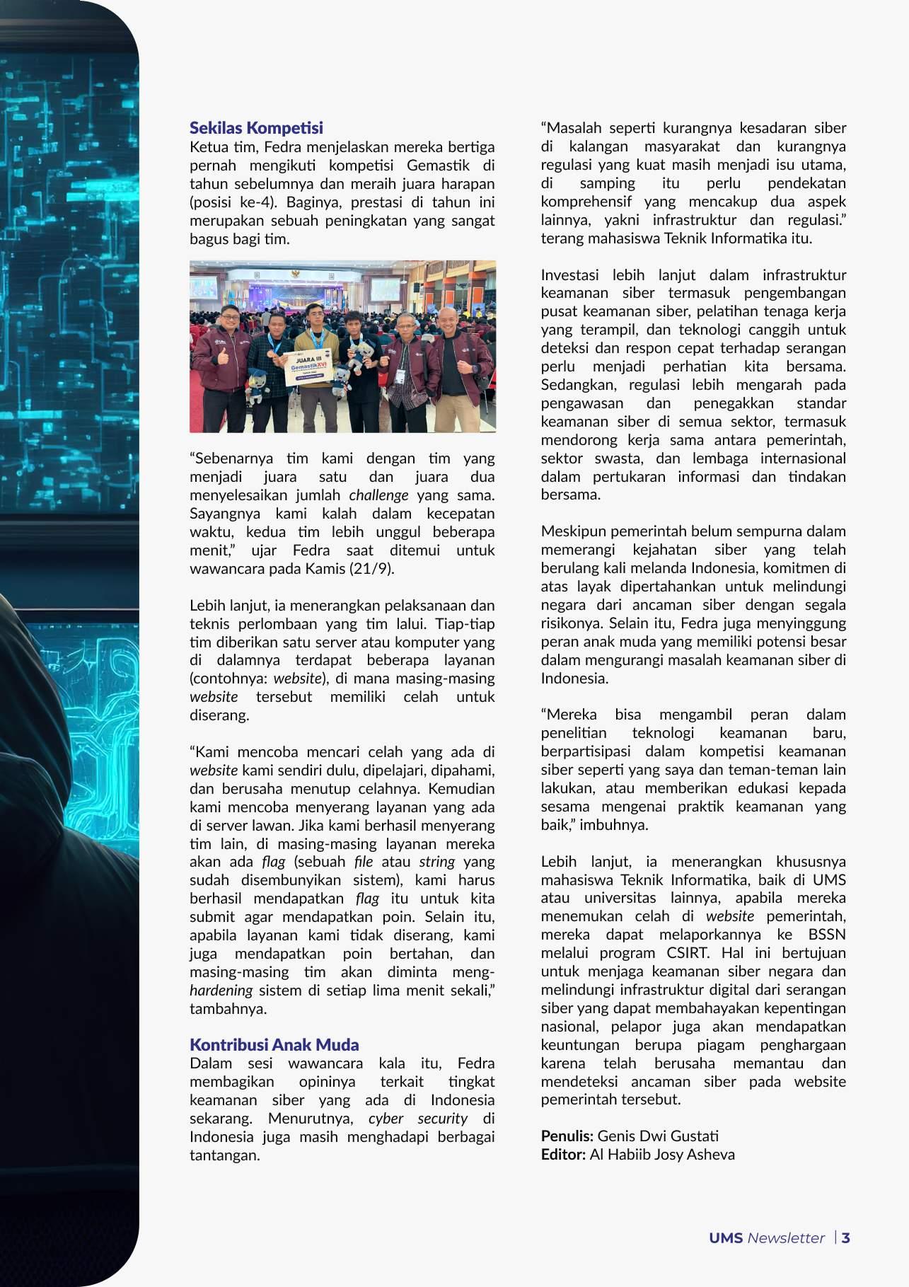 UMS Newsletter mengemas artikel-artikel mendalam seputar penelitian dosen, isu terhangat, sudut pandang pakar, prestasi mahasiswa hingga kabar terkini kampus. Melalui UMS Newsletter, kamu akan tetap terhubung dengan momen-momen historis maupun hal-hal baru yang terjadi di UMS. Pastikan kamu selalu terhubung dengan UMS; rumah kedua bagi seluruh sivitas akademika maupun para alumni.
