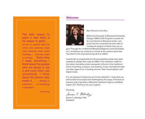 While the University of Maryland University College (UMUC) Arts Program is known for its commitment to Maryland artists, I am proud that the university has been able to increase its support of artists from our region. Through the 1st Biennial Maryland Regional Juried Art Exhibition, art patrons can continue to marvel at the creative spirit that flourishes in this area and comes alive at UMUC. I would like to congratulate the 54 accomplished artists who were selected to display their work at UMUC. This exhibition reaffirms the notion that while artistic expression is found in the traditional forms of painting, sculpture, and drawing, it also resonates throughout other types of art, including ceramic, fiber, found objects, and digital media. It is my pleasure to welcome you to this exhibition. I hope that you will be both encouraged and challenged by the range of diverse expression that originates in Maryland, Northern Virginia, and Washington, D.C. Thank you for your support.