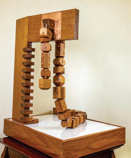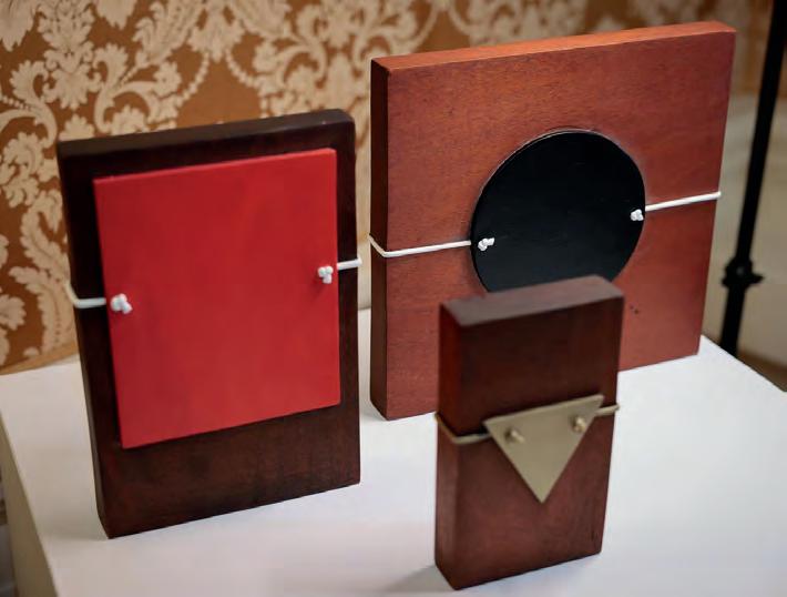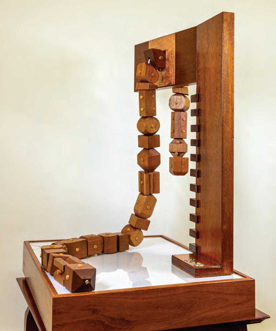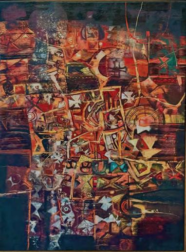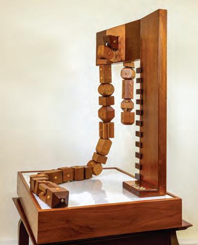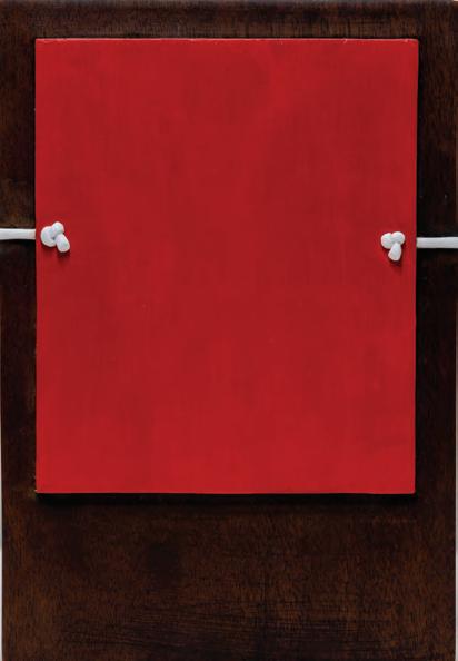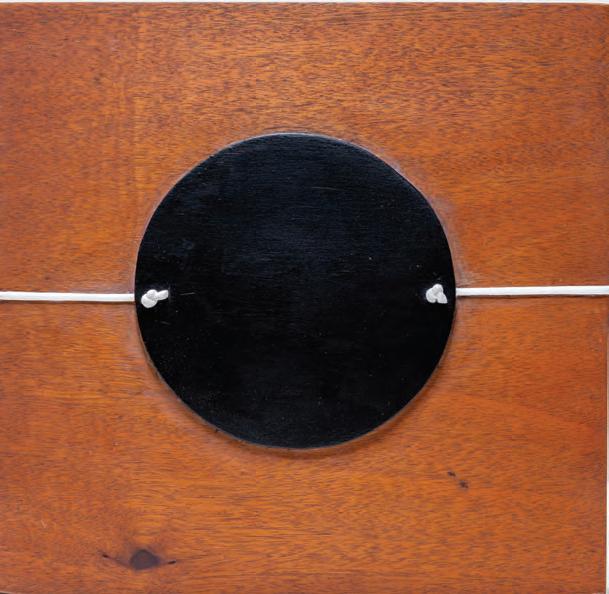 Above: top to bottom: Michelle Talibah, One, 1979, Acrylic on canvas, 36 x 48 inches, Collection of New Door Creative Gallery; Stanley Greaves, Slave Stock and Whip, 2018, Mahogany, copper, plexiglass, nylon cord, Brazil cherry, and pine, 30 x 19 x 24 inches, Collection of the Art Museum of the Americas