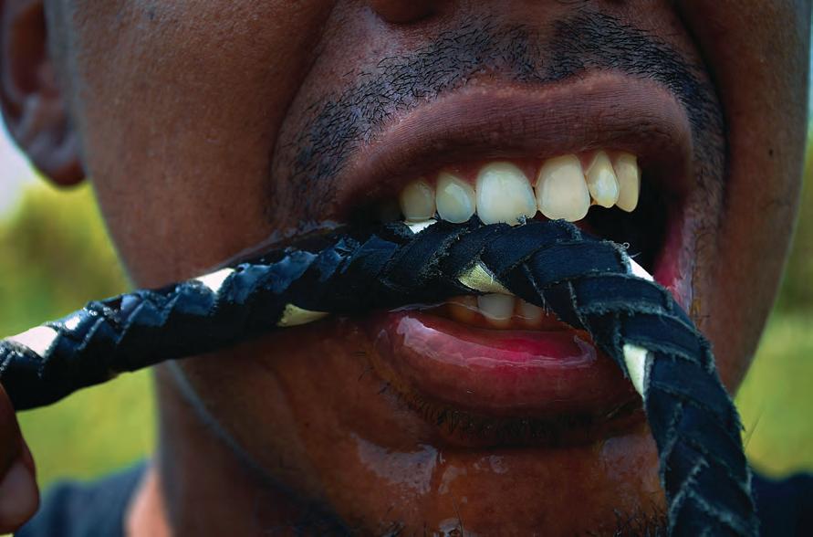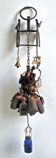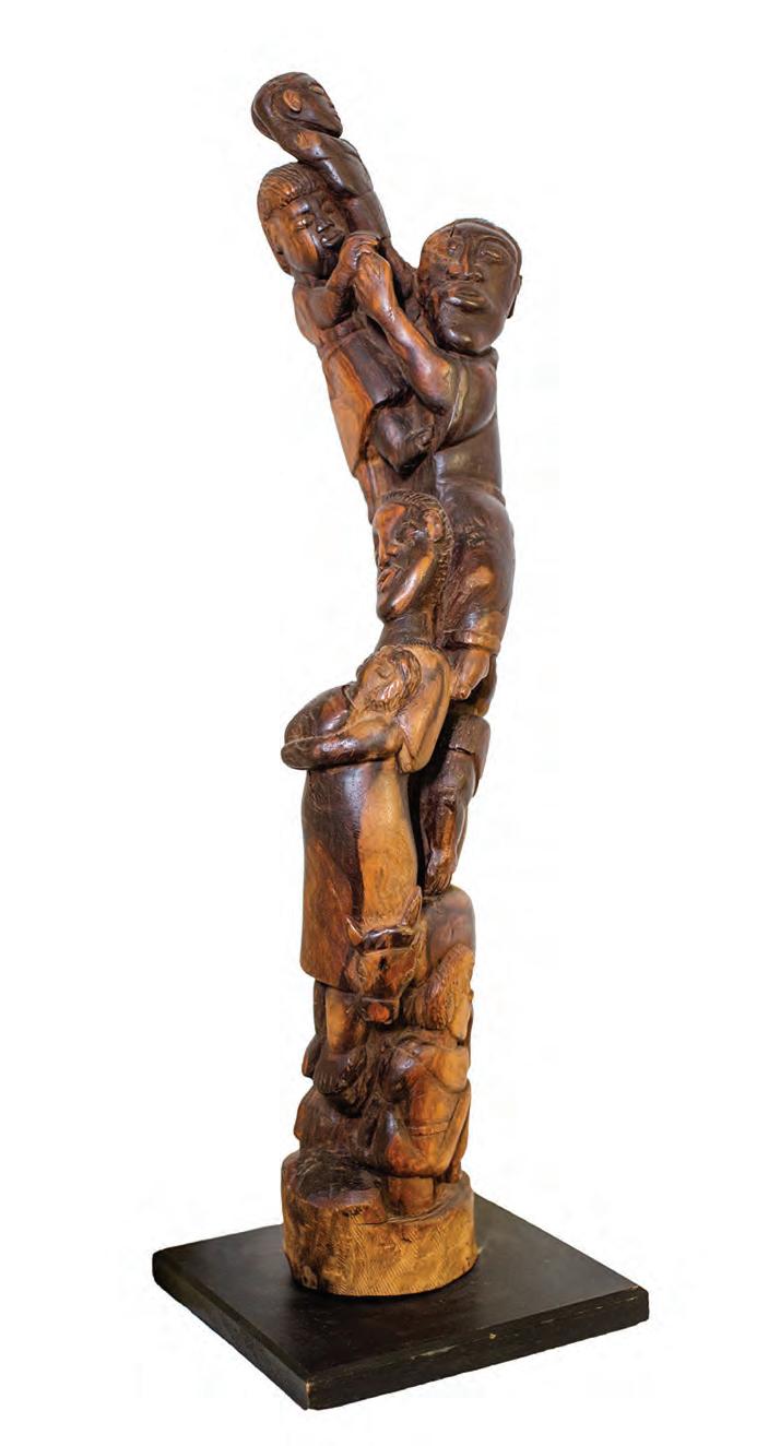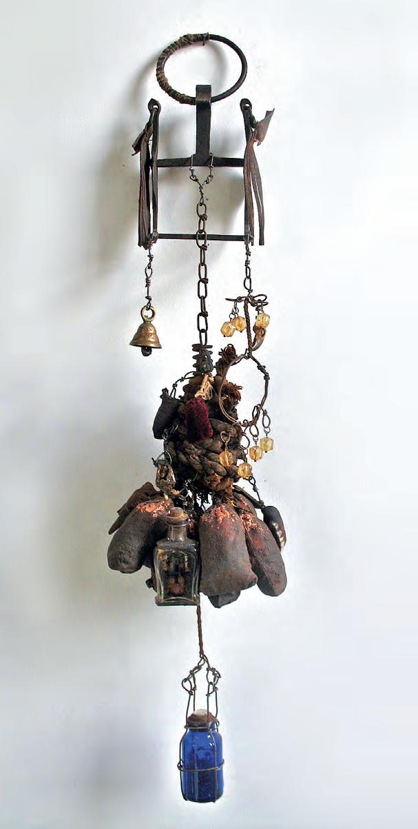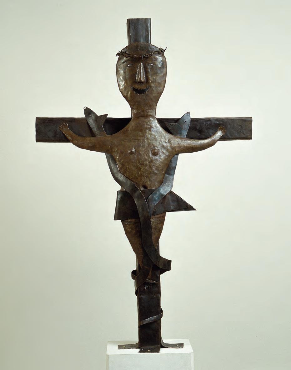 Several artworks by Stanley Greaves, Luis Vasquez La Roche, and Georges Liautaud directly address slavery through materials and concepts linked to African ancestral commemoration. Greaves’s sculpture, Slave Stock and Whip, uses mahogany, Brazil cherry, and pine. Liautaud’s iron sculpture, Crucifixion, features two serpents entwined on a figure on a cross. La Roche’s performance piece, The Cleanse (La Limpieza), involves using a whip as a metaphor in tribute to his Trinidadian African orisha. It was initially performed at Documenta Fifteen in 2022 in Kassel, Germany.