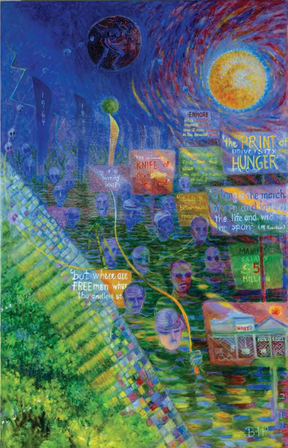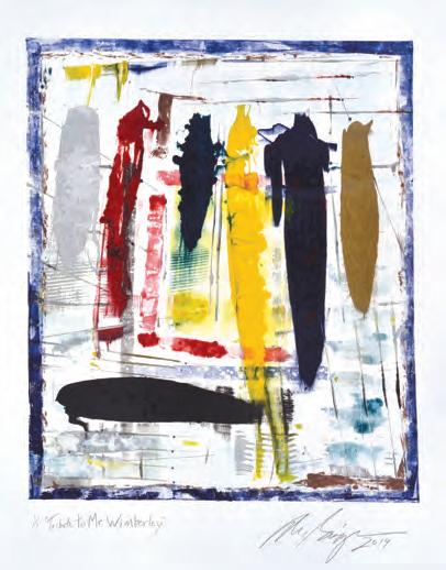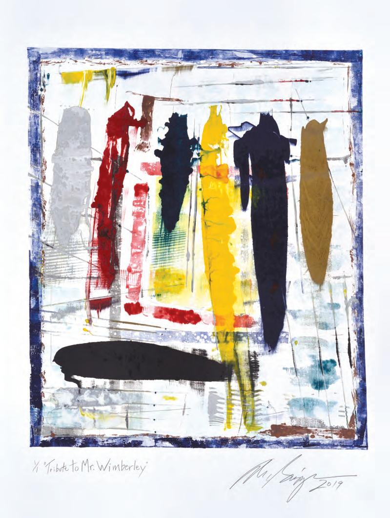 Claudia “Aziza” Gibson-Hunter, You Got to Give Up the Stuff That Holds You Down, 2023, Acrylic paint and colored pencil on paper, 98 x 503/4 inches; Alec Simpson, Tribute to Mr. Wimberley, 2019, Monotype print on paper, Unframed: 60 x 42 inches, Framed: 653/4 x 48 inches
