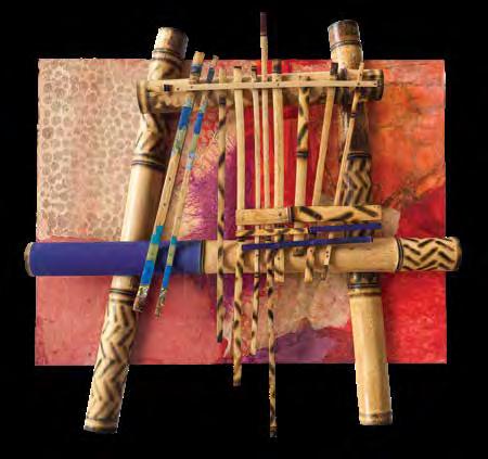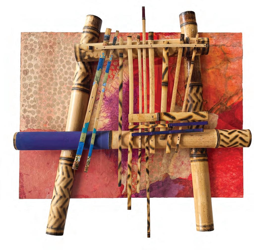 Alonzo Joseph Davis Jr., Kalimba Series #8, 2015, Bamboo construction with collage and paint on board, 27 x 33 x 71/2 inches, Collection of DC Commission on the Arts and Humanities