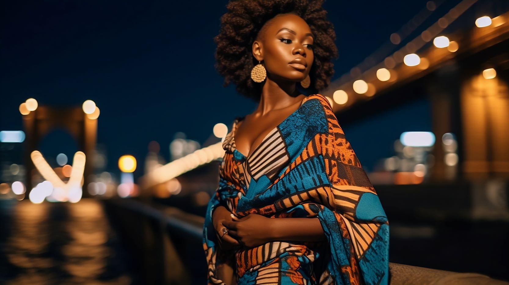 An Igbo woman is photographed on a casual evening walking along a New York waterfront The hues of her ankara dress blend in seamlessly with those of the city night.
