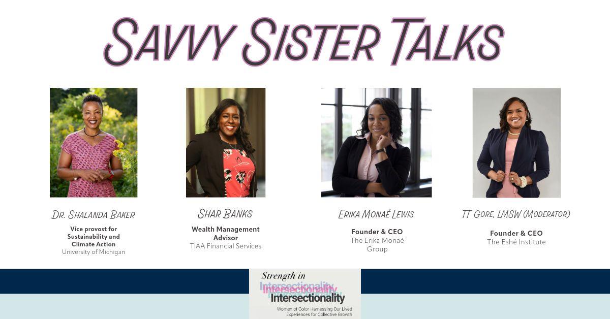 New to the conference this year, The Savvy Sister Talks will highlight the voices of accomplished women of color through dynamic, fast-paced discussions and an engaging Q&A moderated by TT Gore. This session will feature Dr. Shalanda Baker, Vice Provost for Sustainability and Climate Action, alongside Shar Banks of TIAA and Erika Monaé Lewis, exploring topics such as sustainability, financial empowerment and entrepreneurship.