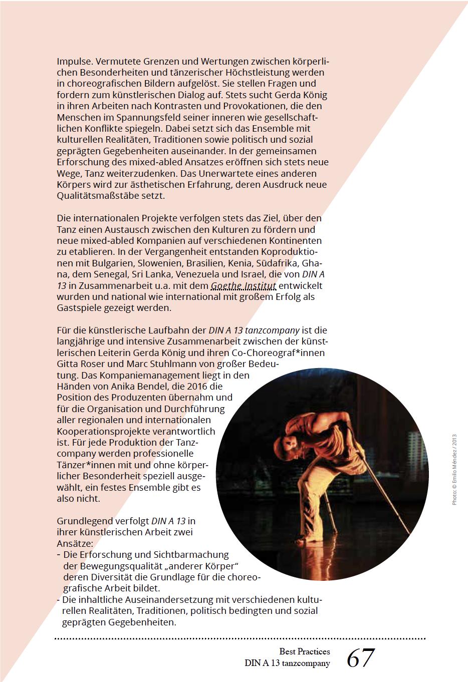 Die inklusiv tänzerische Arbeit kann dabei vor allem einen elementaren Beitrag zur gesellschaftlichen Inklusion von Menschen mit körperlicher Einschränkung leisten und die Wahrnehmung dieser verändern.