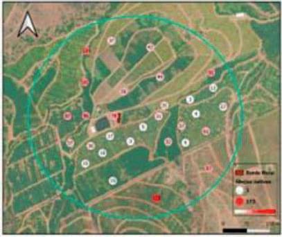 Con el fin de incluir en la propuesta como beneficiarios del proyecto a pequeños y grandes productores agrícolas y a los apicultores asociados a la polinización de sus cultivos, fueron seleccionados para este estudio seis huertos de frutales de importancia económica para el país, insertos en diferentes paisajes agrícolas (tres huertos diversos y tres huertos simplificados), para el desarrollo de las distintas actividades planificadas en una colaboración de dos años con los agricultores (2020-2021), como la instalación de trampas de muestreo de abejas en huerto y entorno, la implementación de un borde de flora nativa de 90m2 y, junto con el apicultor, el monitoreo de las colmenas de A. mellifera destinadas a polinización, que forman el protocolo de Polinización Sostenible.