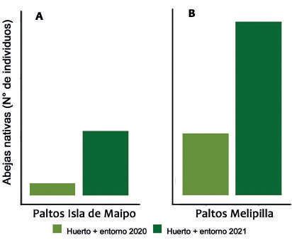 Resulta clave el aumento en la abundancia de las abejas nativas, la floración de las plantas de borde y los atributos del paisaje agrícola, ya que en aquellos con paisaje diverso (paltos Mallarauco y cerezos Melipilla), el crecimiento según sus hectáreas es mayor en comparación con los huertos insertos en paisajes simplificados (paltos Isla de Maipo y cerezos Paine).
