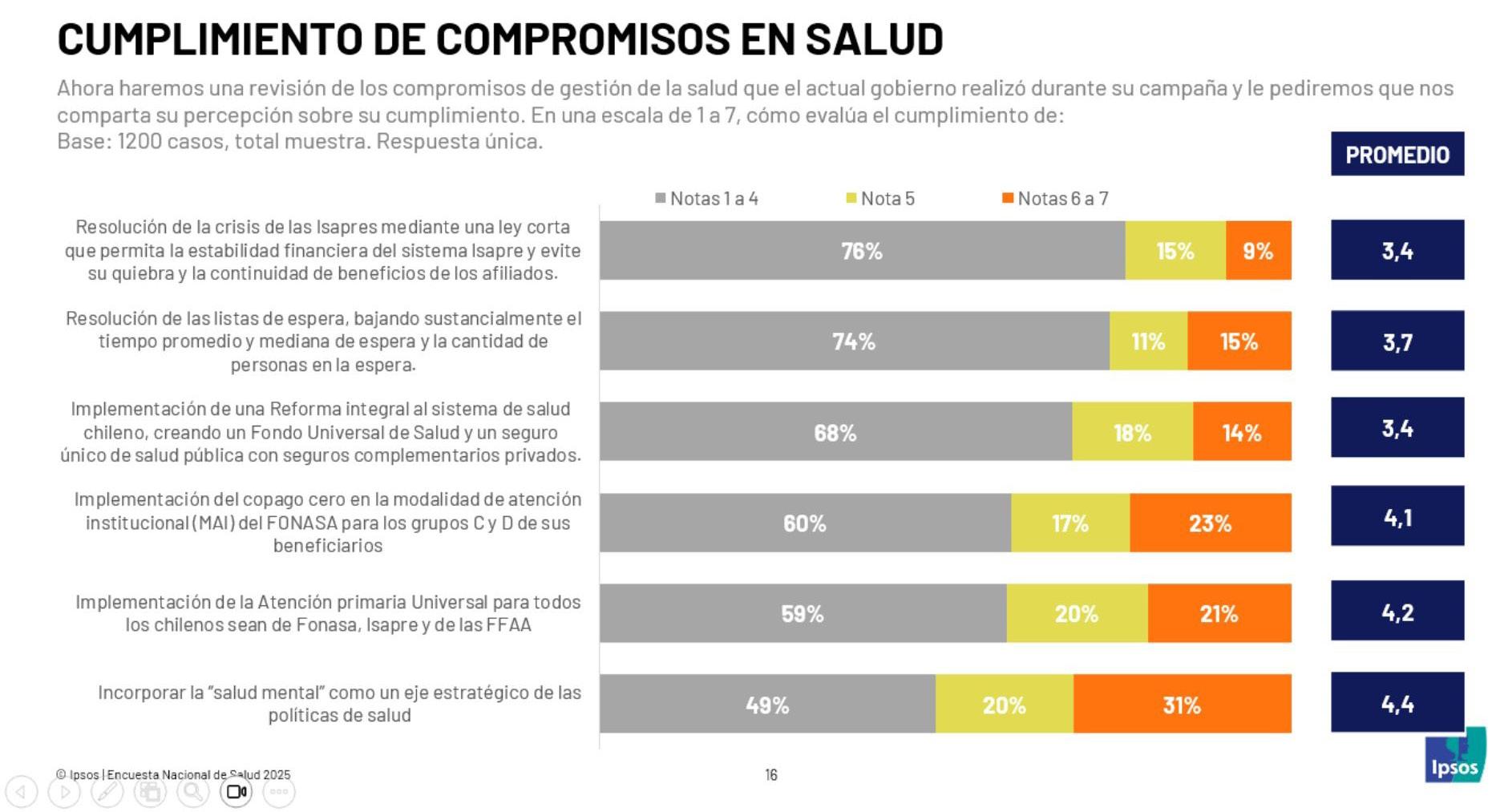El informe muestra que la resolución de la crisis de las isapres recibió una nota 3,4, en gran medida porque “el costo de la solución terminó traspasándose a las personas, a través del alza en los planes y la migración forzada de más de 600 mil afiliados a Fonasa”, señala Sánchez. En el caso de las listas de espera, pese al aumento de recursos y programas implementados, la evaluación alcanzó solo un 3,6.