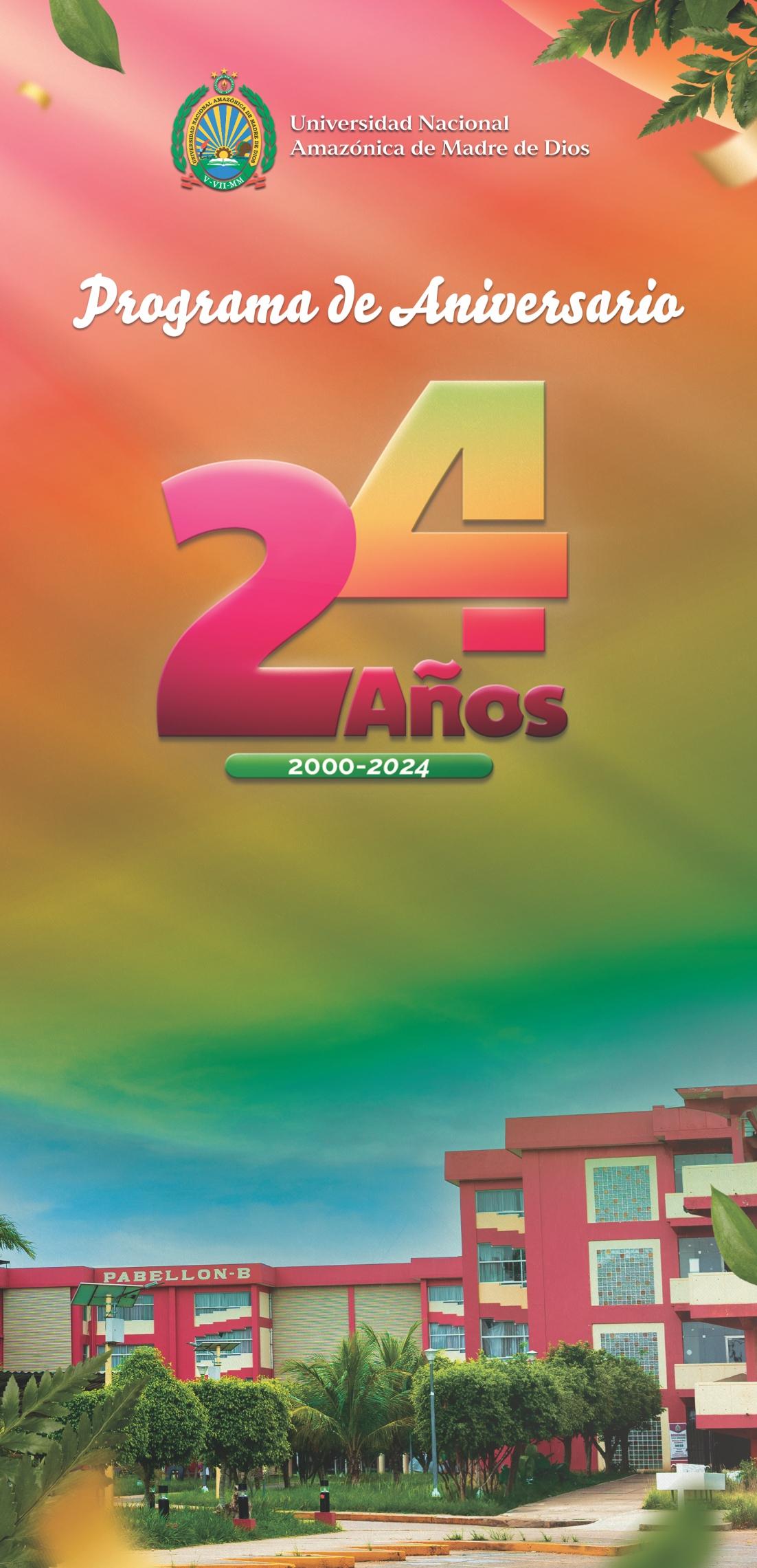 Es un inmenso honor, en nombre de toda la Comunidad Universitaria, presentar el Programa de Festejos por el XXIV Aniversario de la Primera Casa de Estudios Superiores de Madre de Dios, nuestra entrañable UNAMAD.