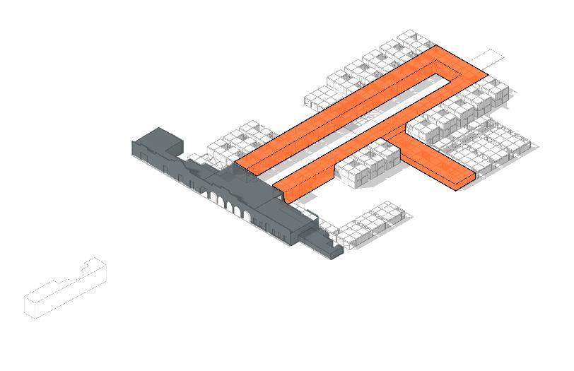 Create a connecting passage by es tablishing a pedestrian walkway and introducing public program.