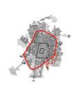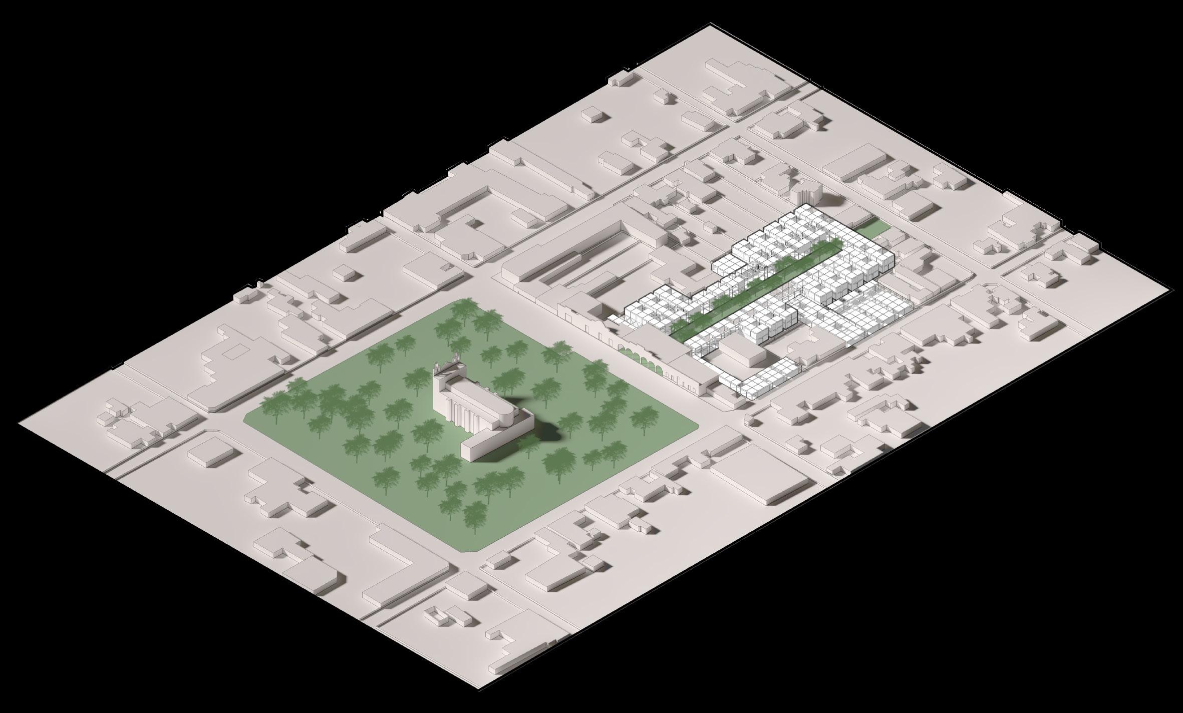 Reorginize the occupation area in a more dense configuration that responds to the existing public space and historic buildings.