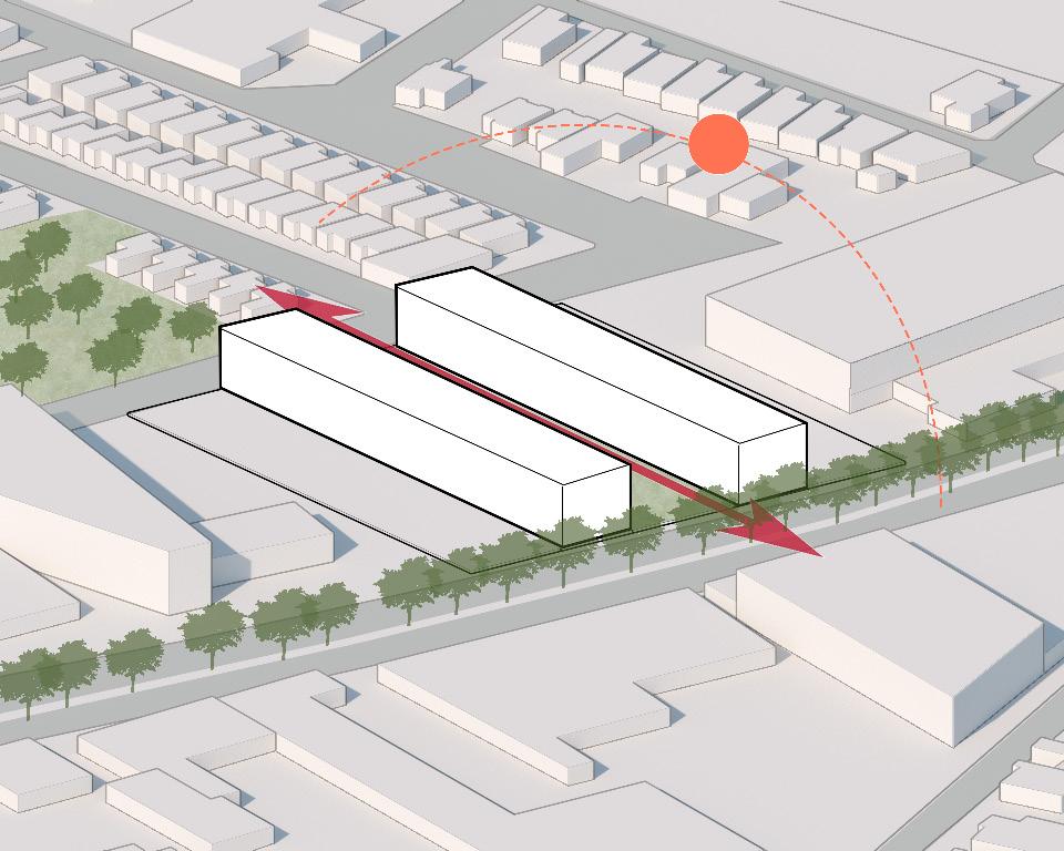 Concentrate all public program in the central walkway and private program for the housing behind both buildings.