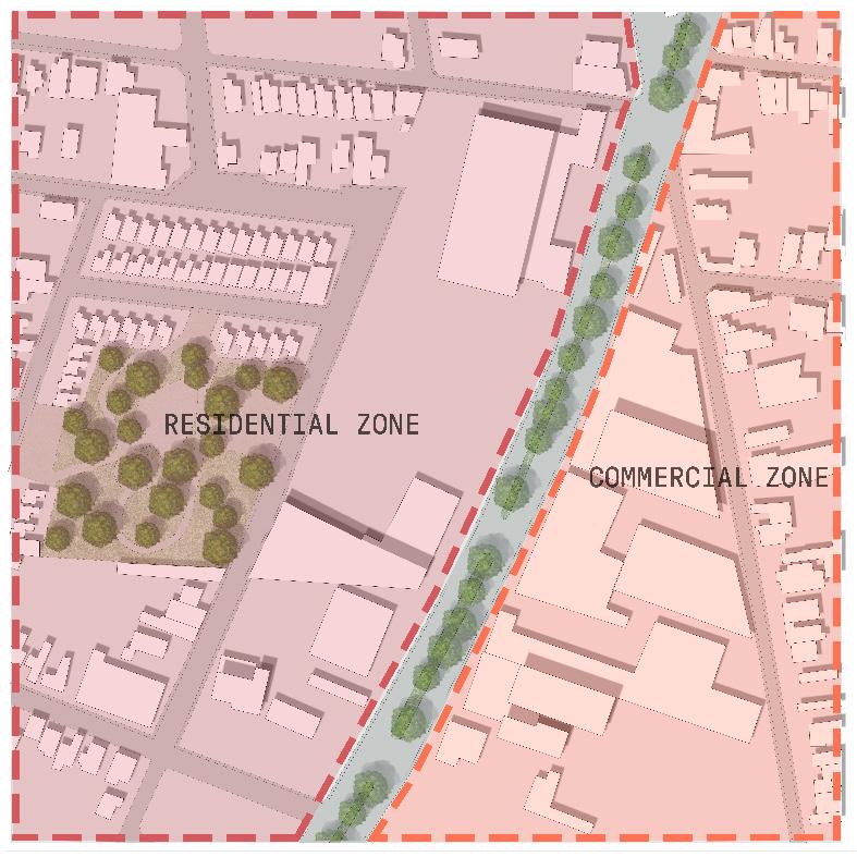 Identifying an existing desconec tion between a residential zone and a main road with sevices and commercial