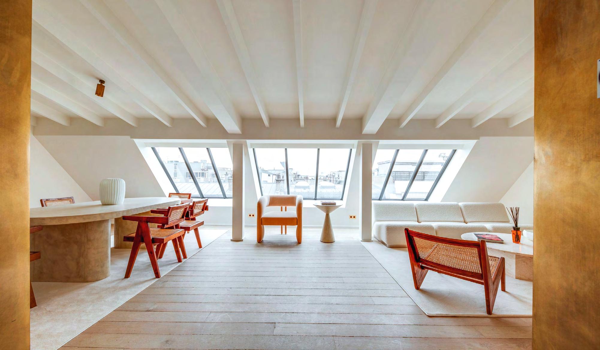 Au cœur du Marais, aux derniers étages avec ascenseur d’un immeuble rénové, deux magnifiques appartements réunissables d’une surface totale de 247 m2 avec 58 m2 de terrasses.