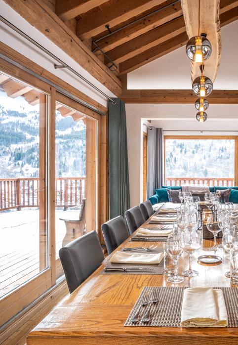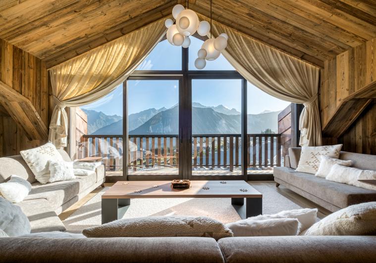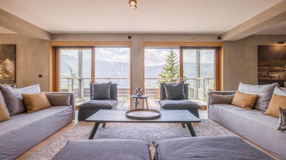 La vue imprenable sur les sommets alentours et la lumière naturelle qui rentre à flots par les larges baies vitrées font partie des nombreux points forts de ce chalet de prestige.